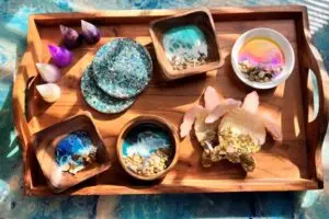 Fyre Art Studio Art Market table with examples of resin art in trays and lazy Susan. Vibrant resin art on display.